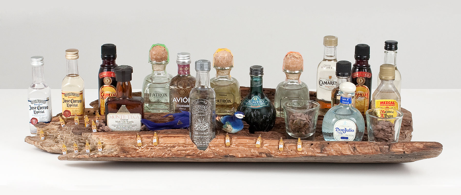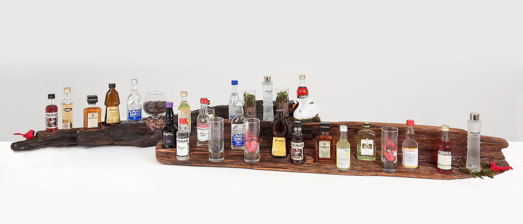 There are many different themes that we embrace. Some of us want our settings to represent our culture or nationality, and some may want their settings to represent the liquor(s) they prefer the most. I started my piece of driftwood with bottles imported from Ireland. From there, I incorporated different representations of my background, in the end, the piece was made and really makes the setting stand out. Afterwards, I decided to make other pieces. Above you will see pieces that represent images of Italy. Some are for top shelf lovers and some are for bourbon lovers.