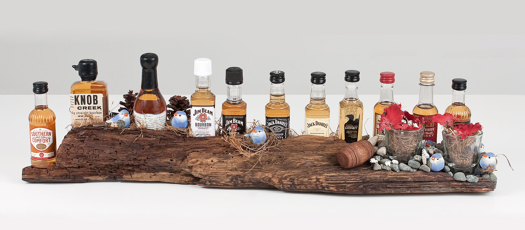 The possibilities are endless. If you have particular liquors you favor, sports teams you love, cities you love, all representations of your choosing can be set on a piece of driftwood